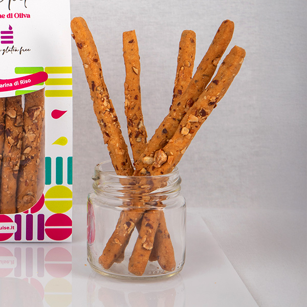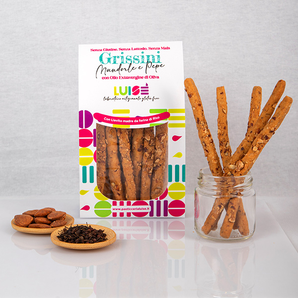 Farina di riso, amido di riso, amido di tapioca, lievito naturale, mandorle, 15% olio evo, sale, pepe, agente lievitante difosfato disodico, carbonato di sodio.