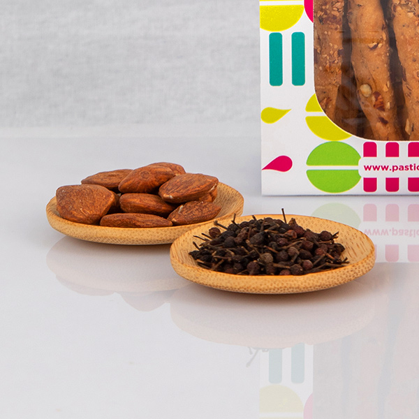 La nota dolce delle Mandorle si sposa con la parte speziata del Pepe selvatico del Madagascar, ricchi di fibre e sali minerali.